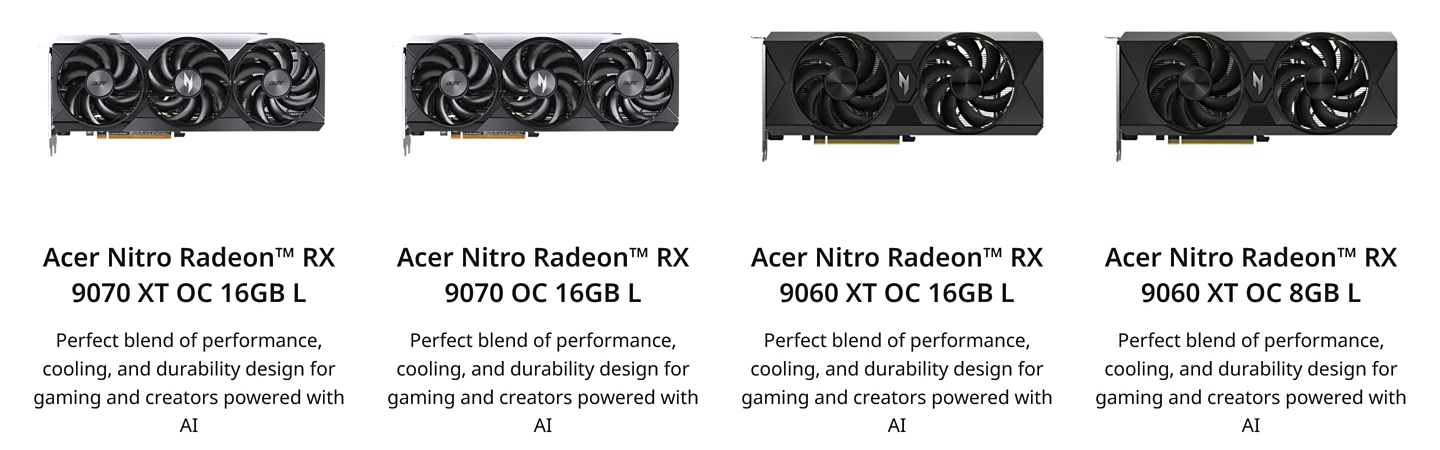 PREDATOR BiFrost Radeon RX 9070 XT OC 16G White Edition PREDATOR BiFrost Radeon RX 9070 OC 16G White Edition Nitro Radeon RX 9060 XT OC 16GB White Edition Nitro Radeon RX 9060 XT OC 8GB White Edition
